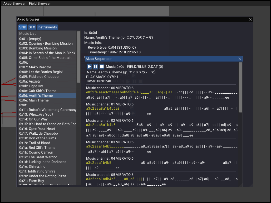 Project is at beginning point. I started with AKAO engine implementation. Original data requires to launch it. It can play music with some effects, but not all of them are fully implemented. And there are some issues with playing.